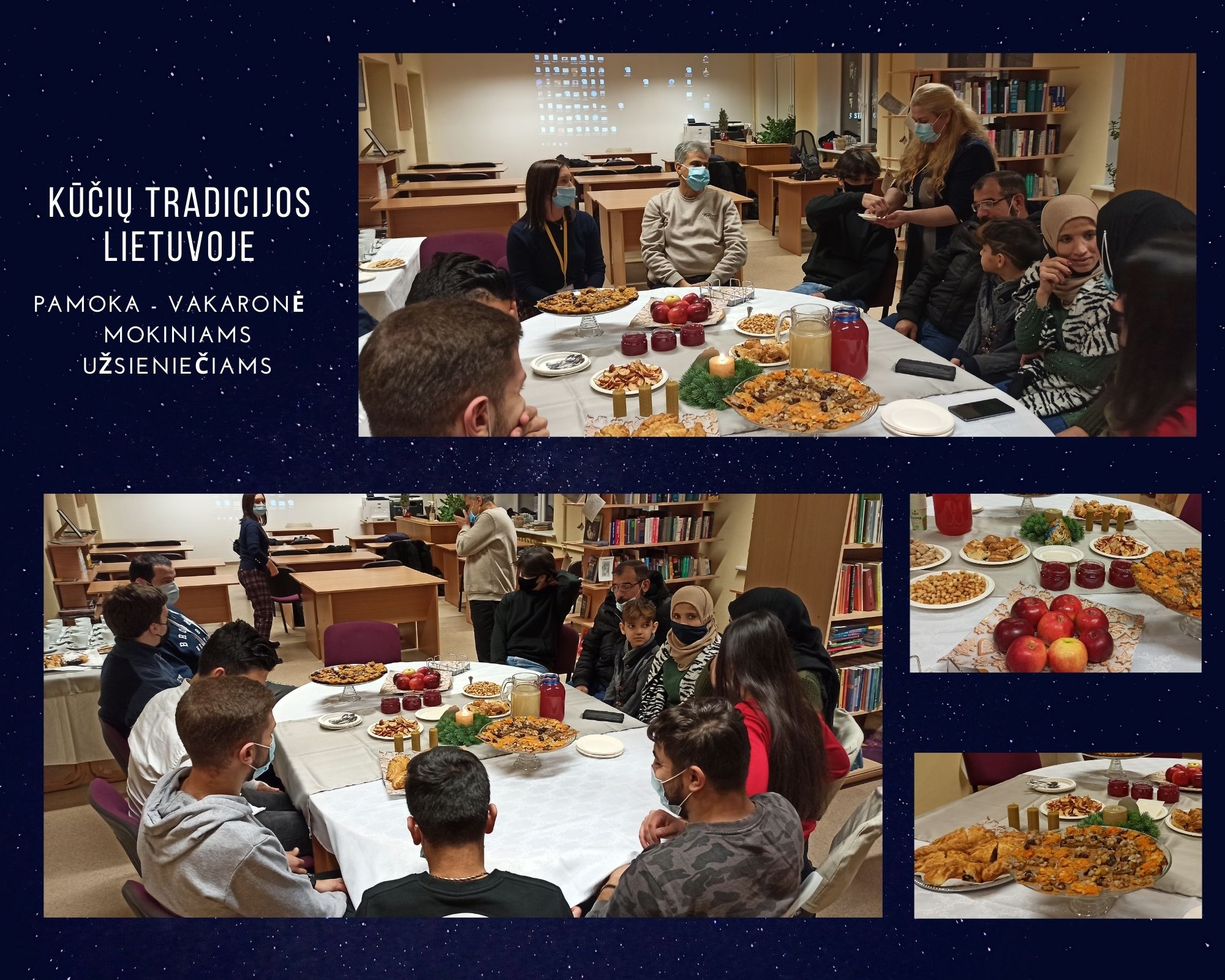 Po trumpo pristatymo susėdome prie balta staltiese užkloto stalo, ant kurio buvo sudėti tradiciniai Kūčių valgiai. Laužėme kalėdaitį, klausėmės kalėdinių giesmių, šiltai bendravome. Mokiniai užsieniečiai ragavo jiems neįprastus patiekalus, teiravosi apie sudėtį ir paruošimą. Vakaronės pabaigoje visi dalyviai gavo simbolines dovanėles.